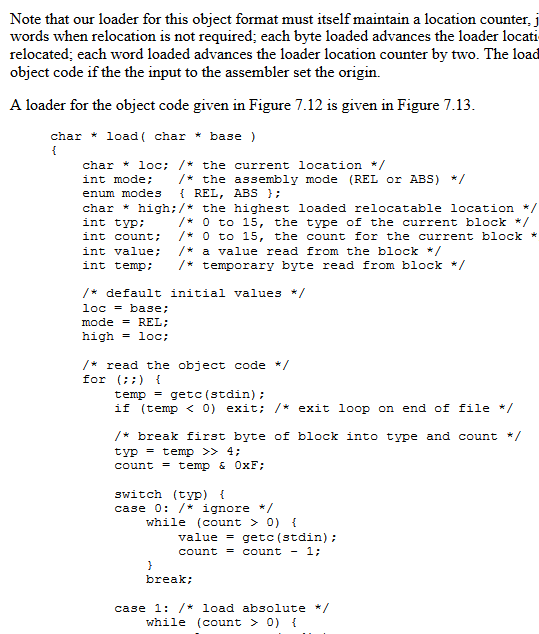 This uses a load function such as the one defined in Figure 7.8 or Figure 7.13 to load the relocatable parts of each of the files into consecutive memory locations. If any of the files have absolute components, it is up to the user to be sure that they do not interfere. The shortcoming of this loader is that, although it loades the required object files in memory, it contains no provisions to tell the different files about each other. Programmers using such a system would typically reserve some dedicated (absolute) locations for communication between the routines included in the different files, and this would be very cumbersome.